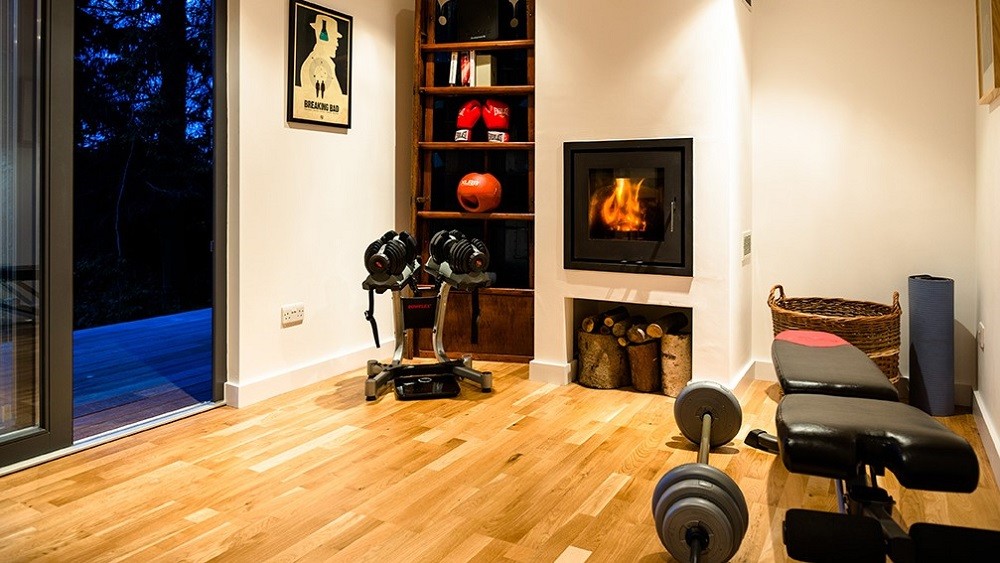This stylish gym is landscaped into a wonderful woodland garden in Matlock. Its bi-folding doors open onto the large deck in summer, while the wood-burning stove keeps it cosy throughout the long Derbyshire evenings.