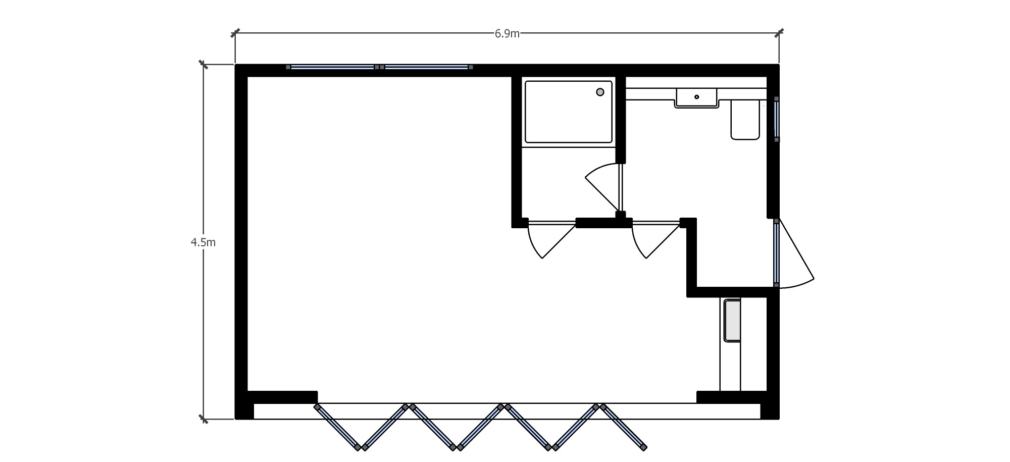 This garden room is a home gym and a pool changing room with bi-folding doors with integral blinds for privacy. Inside air con keeps workouts comfortable, while the hardwood decking provides social space outside. Cedar screens hide the garden sheds.