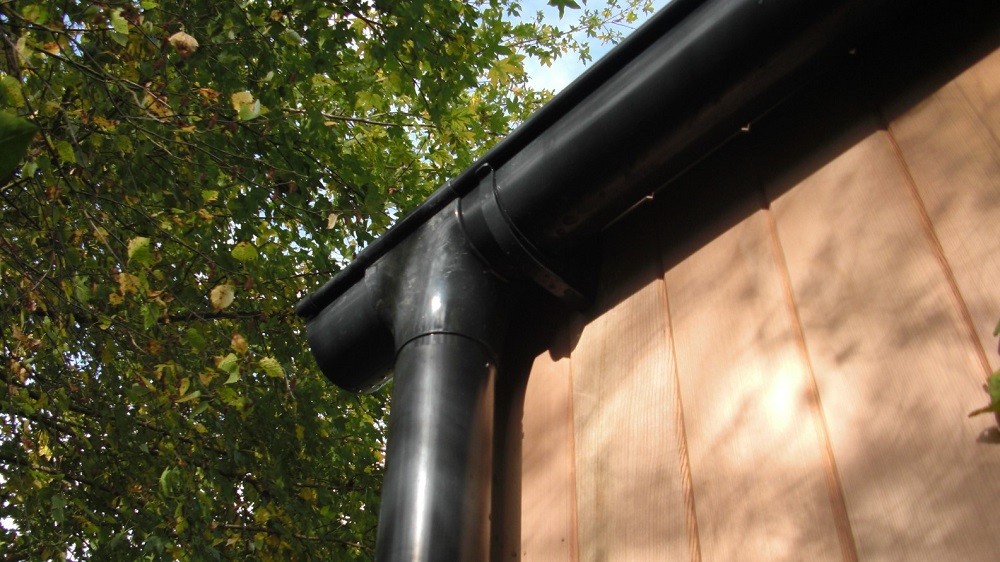 Black PVC guttering and a downpipe connected to a local soakaway (French drain) is provided as standard. A soakaway is a hole in the ground filled with gravel, when the drain is working the water runs into the soakaway and over a few hours soaks into the surrounding ground soil.